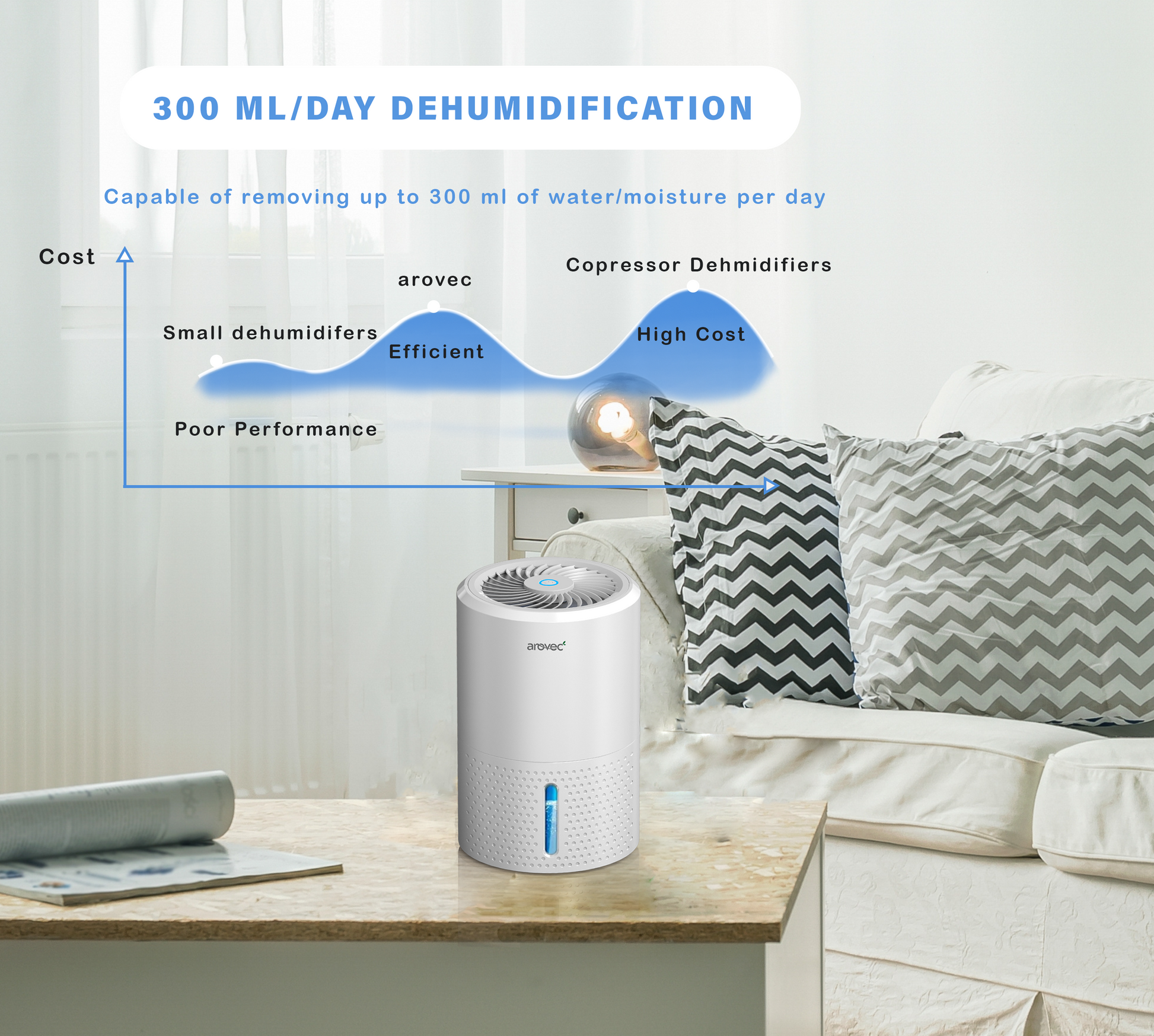 - [300 ML/DAY DEHUMIDIFICATION] Capable of removing up to 300 ml of water/moisture per day with a 900 ml water tank capacity. A visible water tank makes it easy to see the amount of collected water.