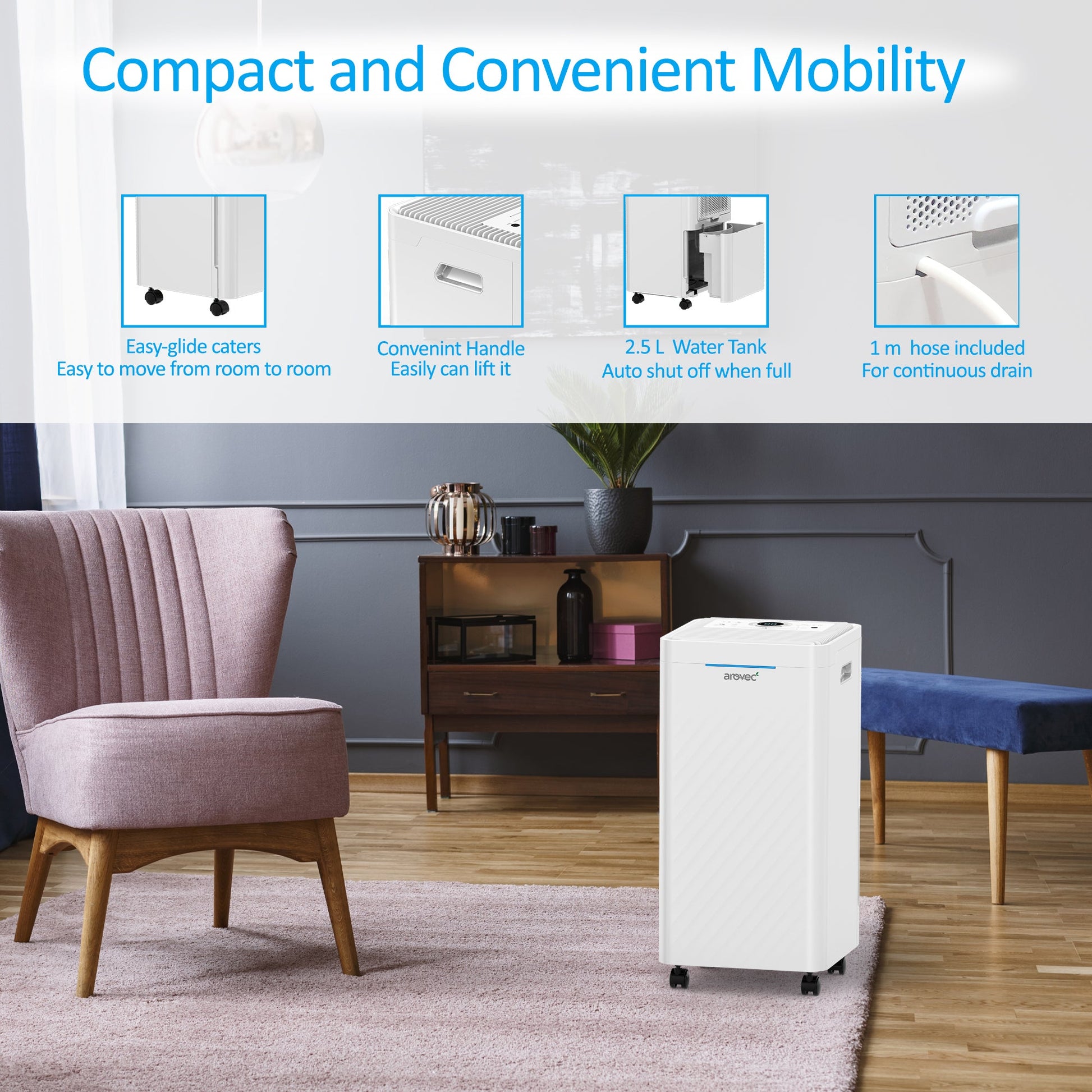 - [Sleek Design & All-Inclusive Functionality] Designed with a digital display and modern look, 2-way water draining control, use the large 2.5 L water tank or its drain hose for a continuous water outlet. Adjustable fan speeds, auto defrost function, 24-hour timer, tank full indicator, filter change reminder, auto shut-off, auto restart, memory function to continue operation after intended restart or sudden power outage restoration, live ambient humidity level Indicator in %RH, and three colours.