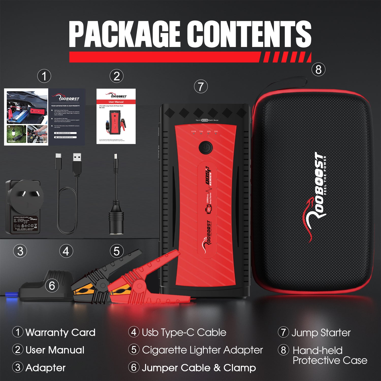 [WHAT YOU GET] RB-1500 Jump Starter, Smart Jumper Cable, Type-C USB Cable, Cigarette Lighter Socket, Strong Handheld Protective Case, User Manual, Warranty Card. 2-Year Replacement Warranty & 30 days money back and friendly Australian based customer service.