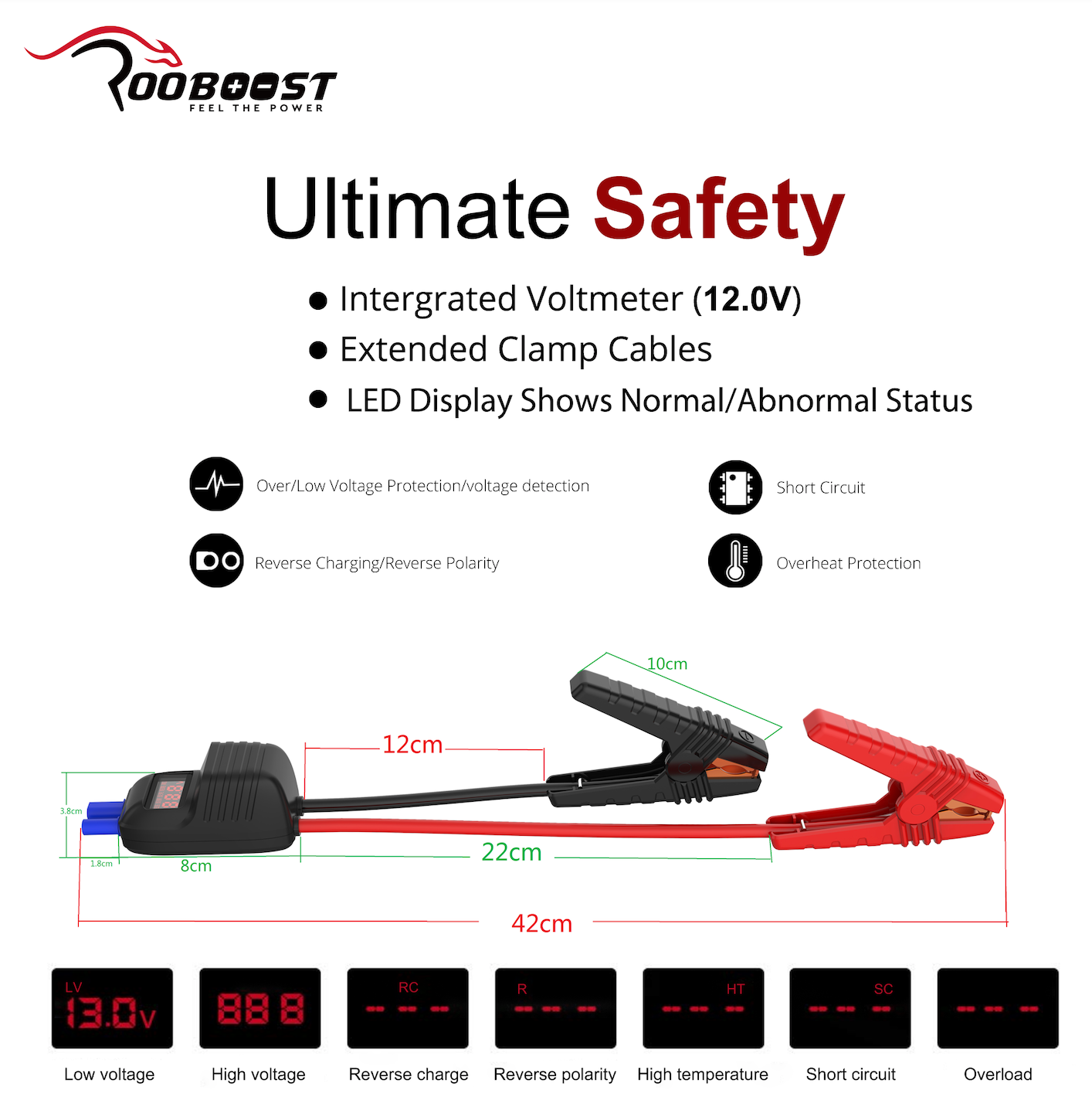 [ADVANCED PERFORMANCE] The mistake-proof designed RB-1500. It contains Smart Jumper Cable with digital displays for enhanced diagnostics and troubleshooting. The displays show vehicle’s battery voltage, normal and abnormal status during jump start.