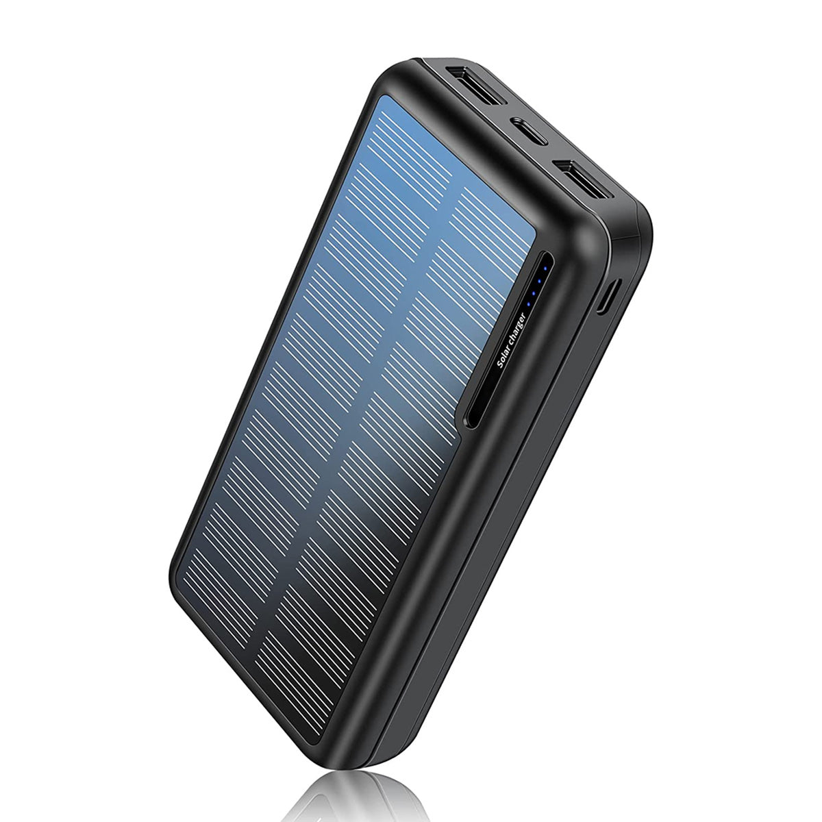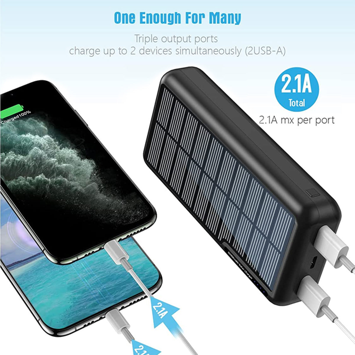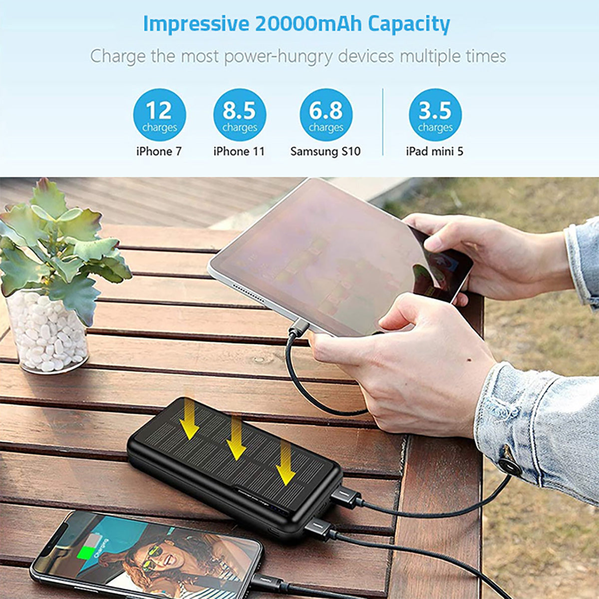 Solar Power Bank 20,000mAh, Portable Charger with 2 USB Outputs, Type-C and Micro USB inputs, External Battery Pack for Outdoor Activities